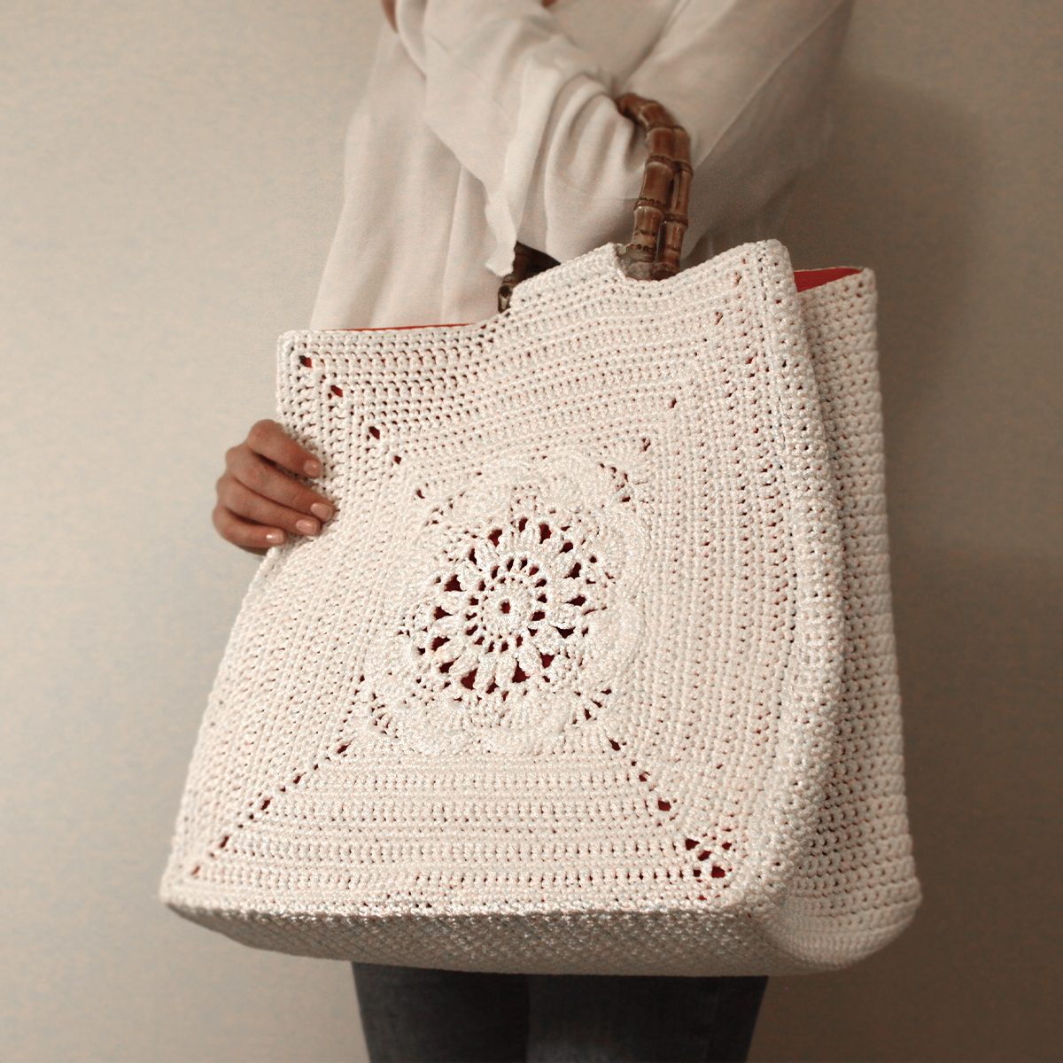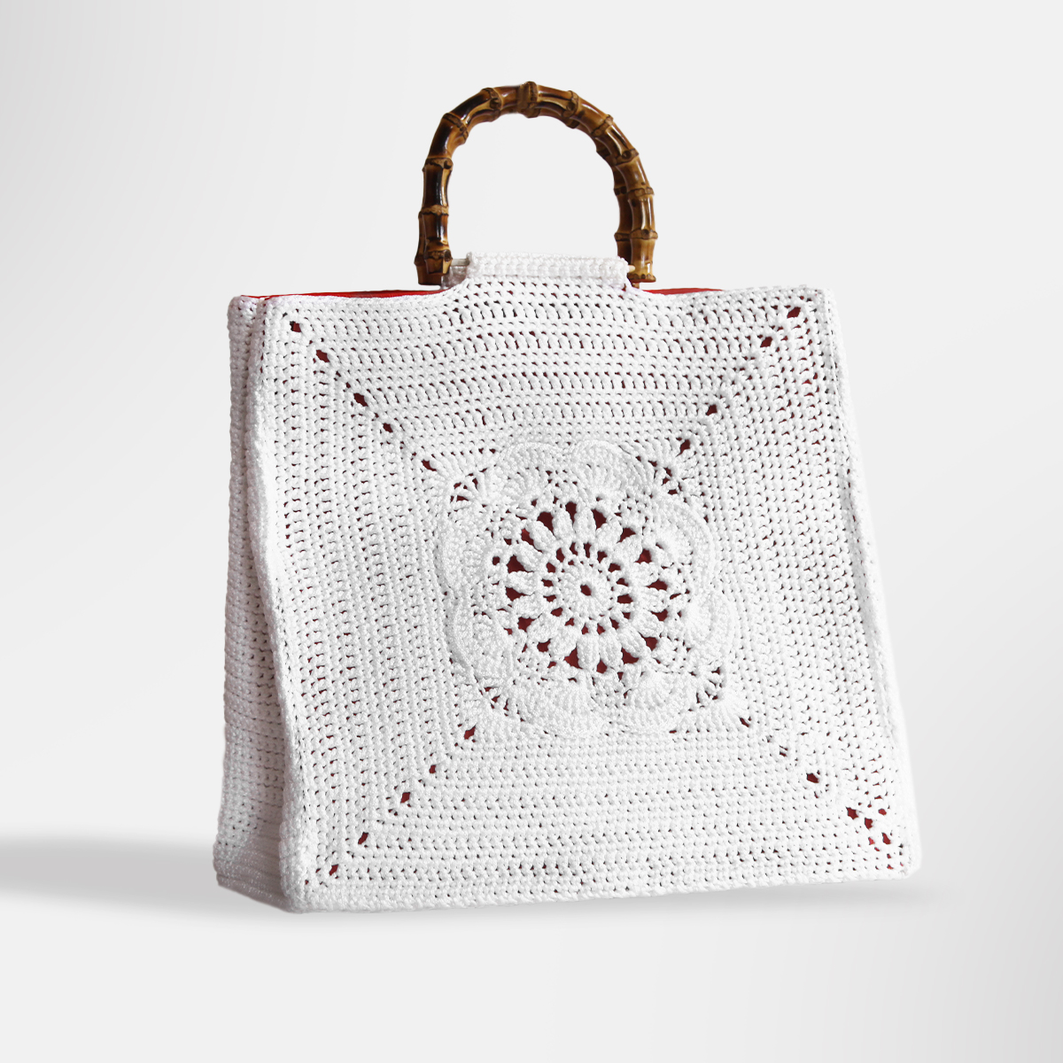 Borsa crochet realizzata a mano in 100% cotone bianco, manici in bambù, foderata all’interno