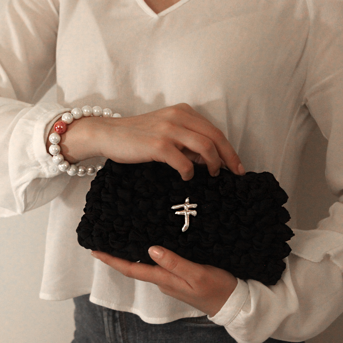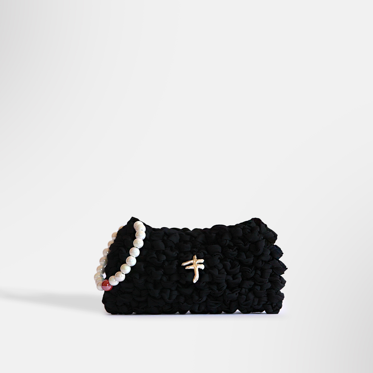 Borsa realizzata a mano in fettuccia nera, gioiello in madreperla bianco, manico con palline in resina, foderata all’interno